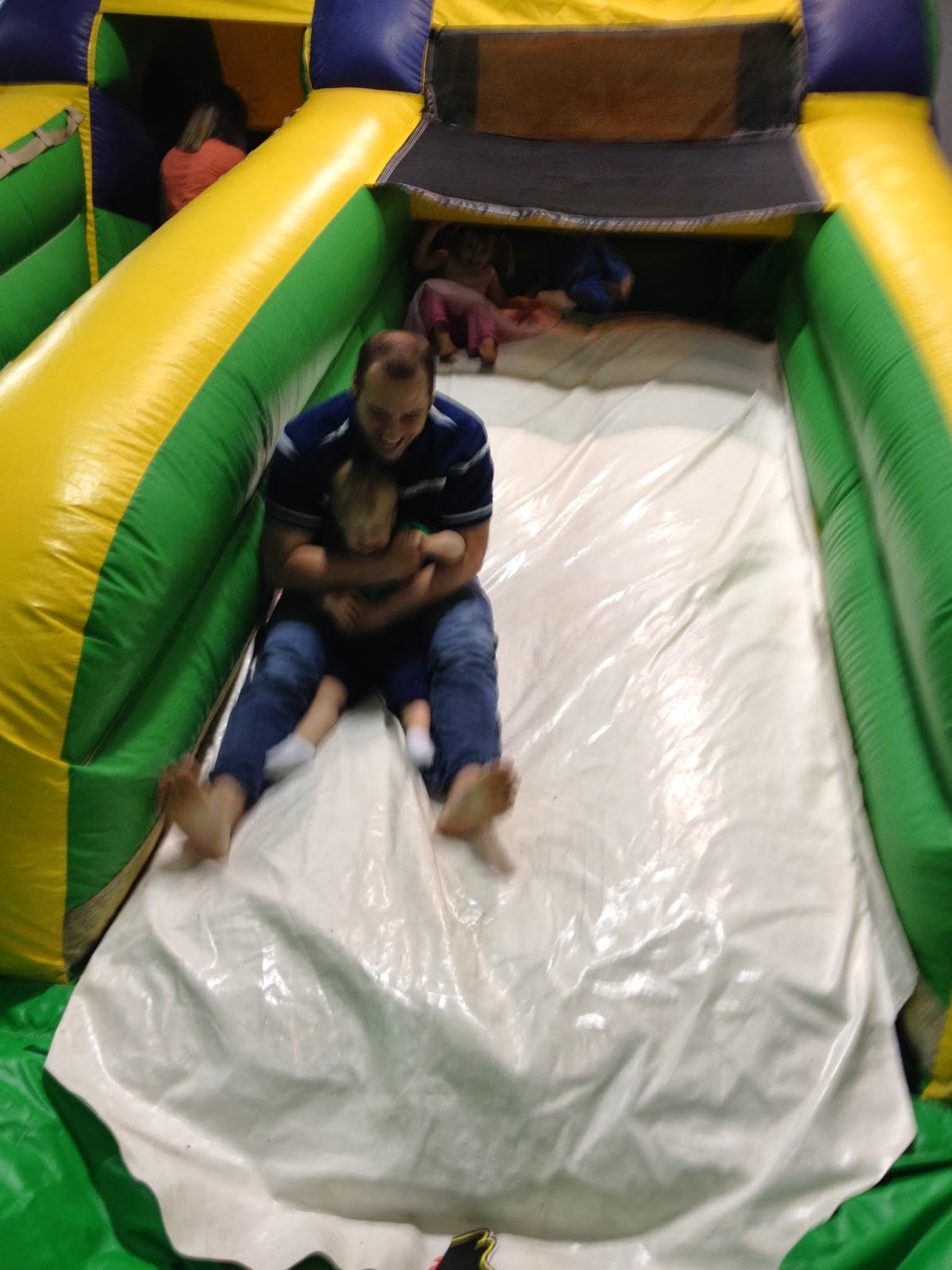 J was unsure of the bouncy thing at first but he loved going down the slide with Daddy!!!